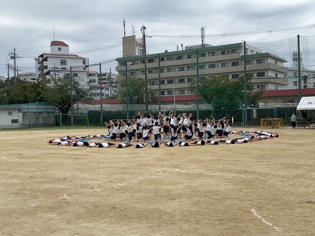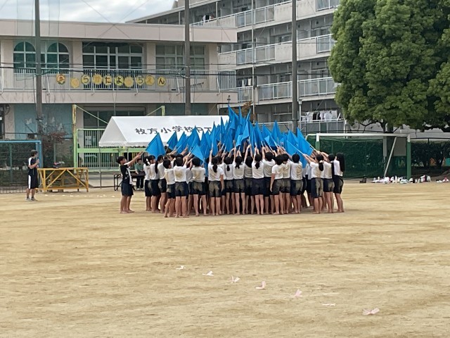 6年生が運動会の団体演技の練習を運動場で行いました。
