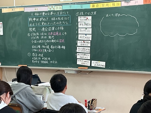 6年生が社会の授業で「平和で豊かな暮らしを目ざして」の単元で、「戦争が終わって、日本の社会はどのように変わっていったのだろう。」について考えました。