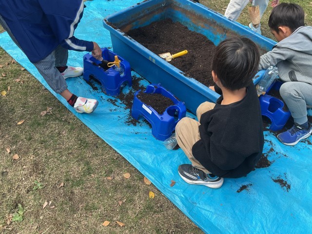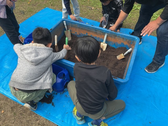 教室でしっかり球根を観察したあと、お手伝いをしてもらいながら、鉢に土を入れて、球根を植えることができました。