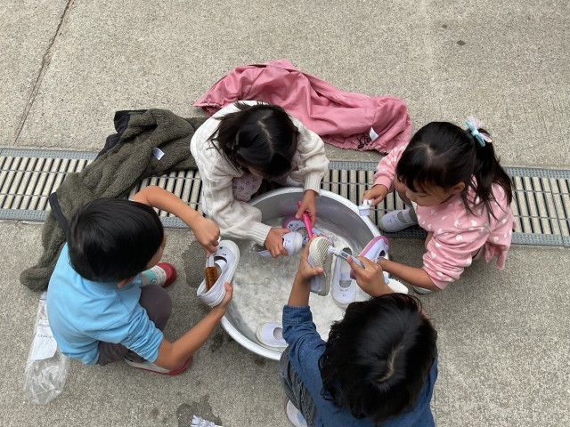 ブラシを持って一生懸命洗っていましたが、普段から自分で洗っている子どもたちもいれば、今回が初めてという子どもたちもいました。