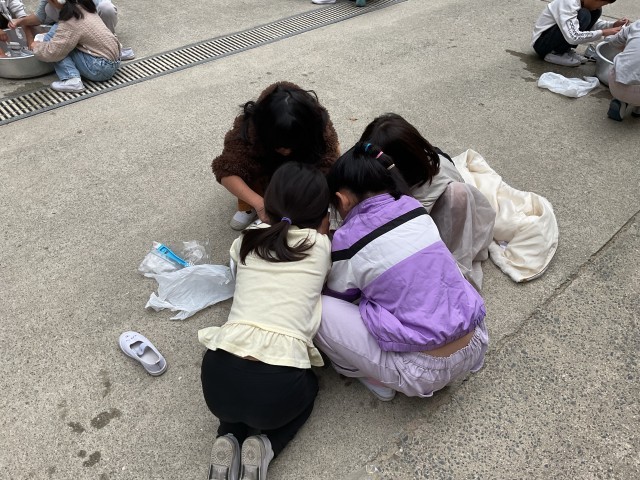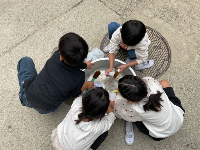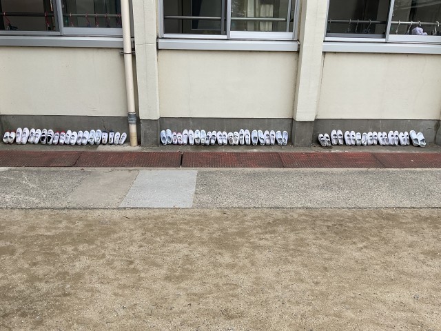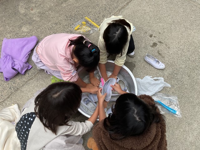 1年生が生活科の授業で「じぶんでチャレンジ大だくせん」という学習で、自分ができることとして、上靴洗いにチャレンジしていました。