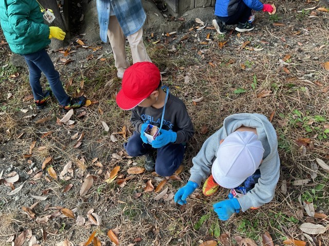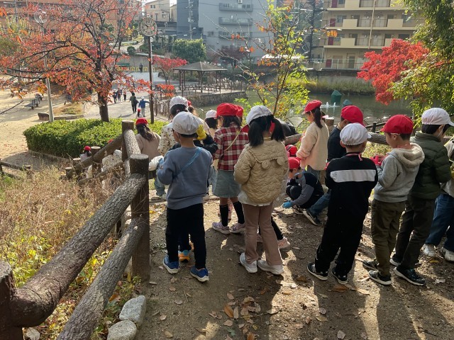 坊主池公園では、どんぐりをひろったり、きれいな落ち葉をひろったりと、たくさんの秋を見つけ、きれいな色、おもしろい形など次から次に、見つけた素敵な宝物を見せてくれました。