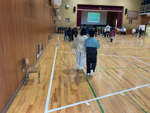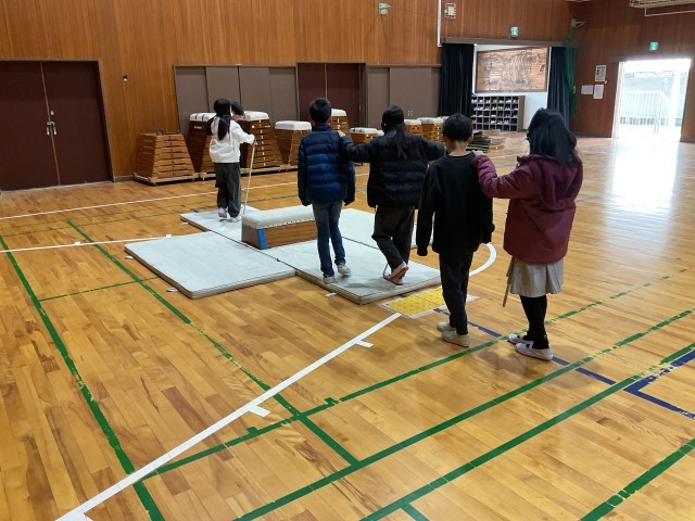 4年生がクラスごとに体育館で白杖体験をしました。