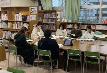 2学期に行った2年生とのおもちゃランド、3年生との迷路づくり、5年生との給食交流での子どもたちの様子などを共有し、今後の取組みも踏まえて、確認などを行いました。