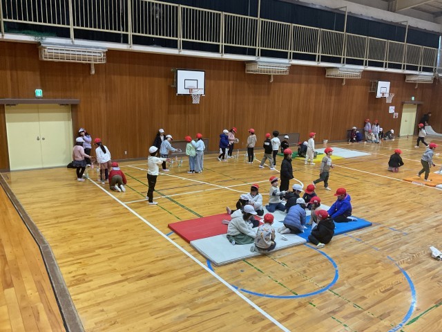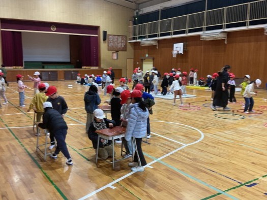 1年生が生活科の時間に準備を進めてきた幼保小連携の「昔遊び交流」のリハーサルを体育館で行いました。