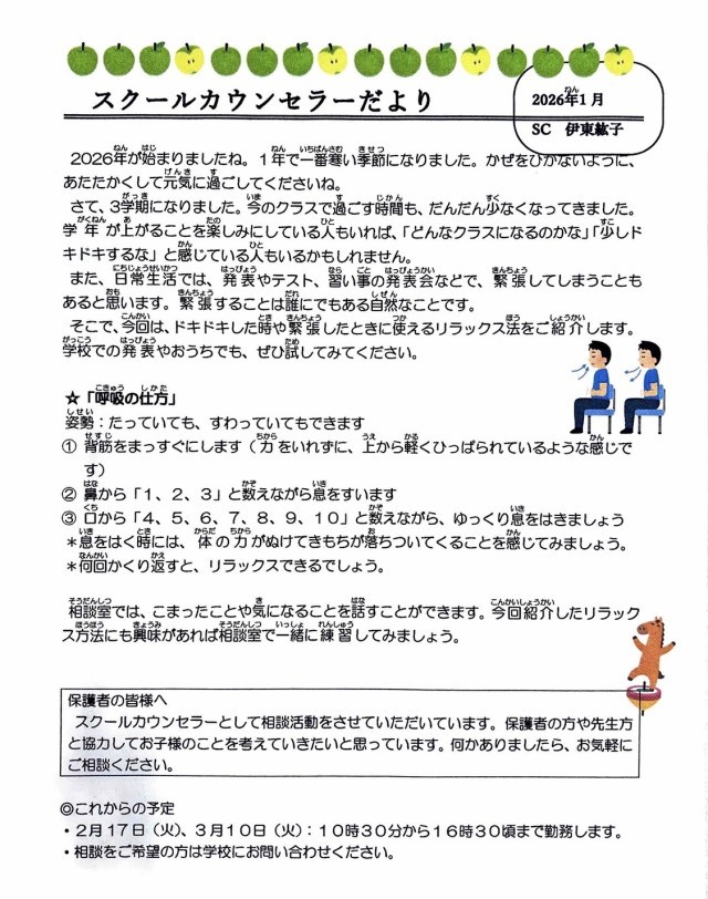 1月21日(木)「スクールカウンセラーだより」の配信について