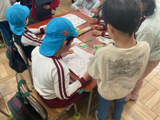 「さかな」や「ロケット」などを一緒に作り、完成した形を1年生がタブレットで写真に撮ってクイズにするなど、楽しみながら学ぶ姿が見られました。