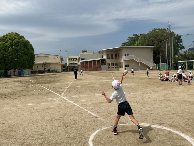 3〜5年生の子どもたちは、ソフトボール投げや長座体前屈、反復横跳び、立ち幅跳びなど様々な種目に、一生懸命取り組んでいました。