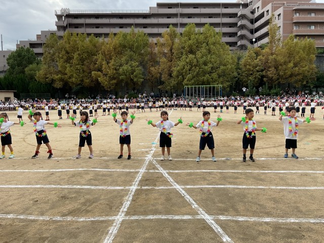 手と首にかわいい花をつけて、笑顔いっぱい楽しく仲良くフラダンスです。
