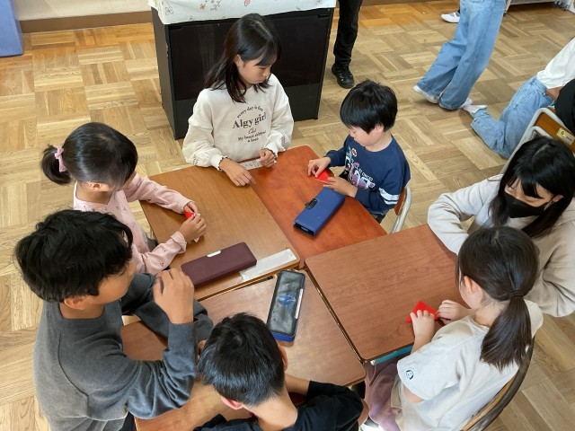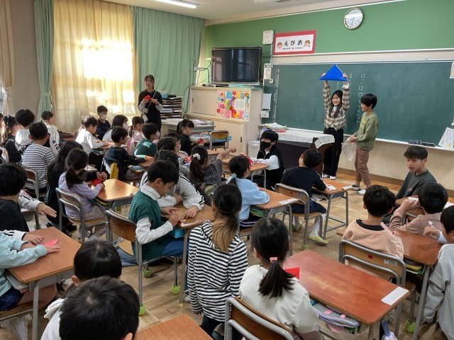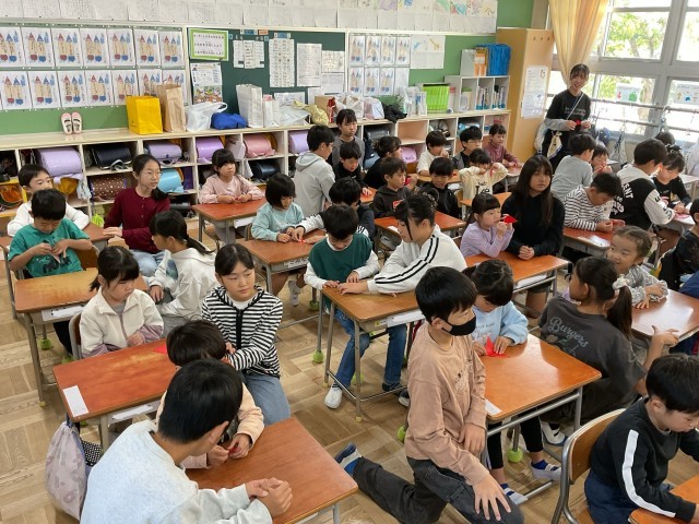 初日は、6年生が1年生と一緒に、折り鶴をつくりました。