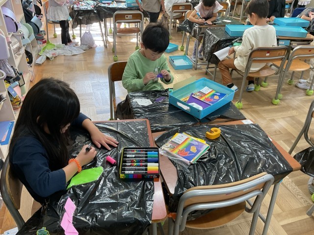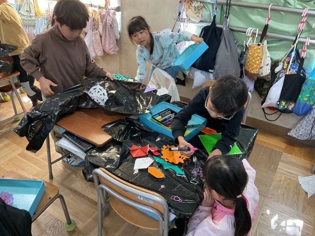 黒いビニールに、思い思いの絵や折り紙を折って飾っていきます。