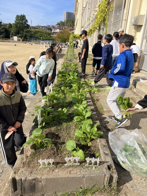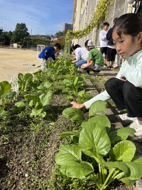 5年生が育てている小松菜が大きくなり、1回目の間引きをしました。