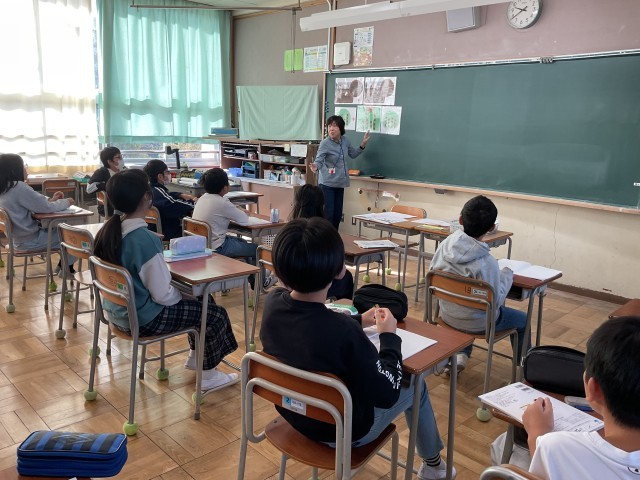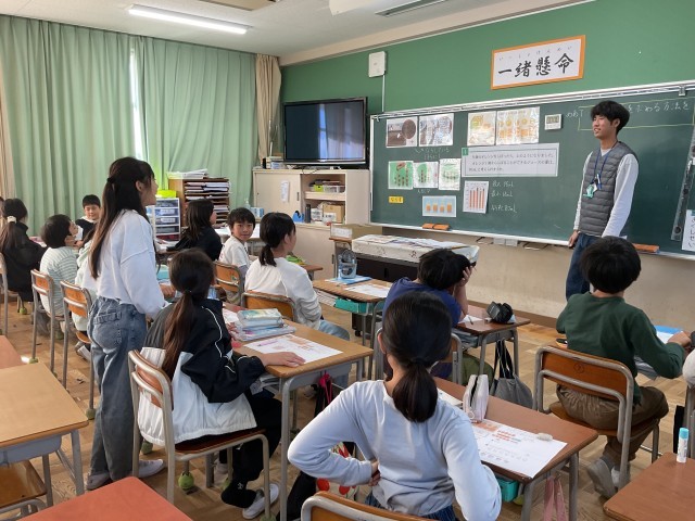 学級担任と少人数指導担当が2つに分けたグループを指導しています。