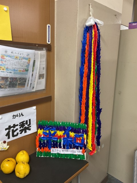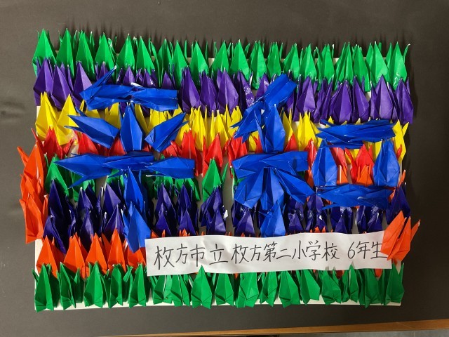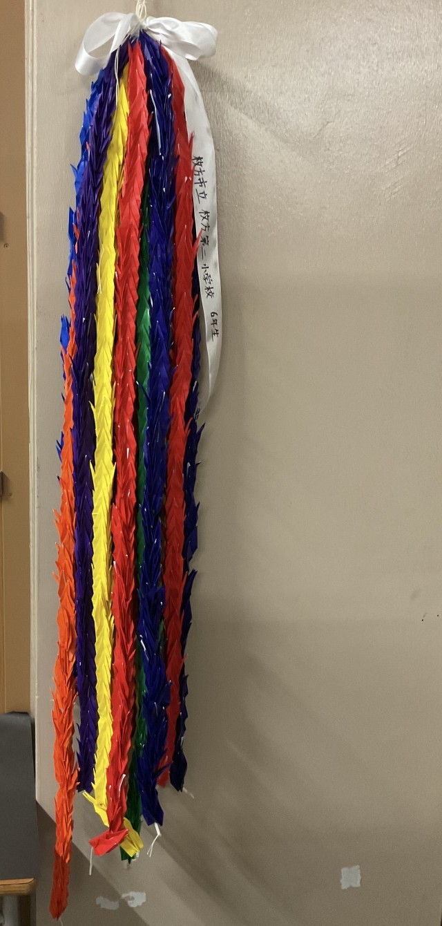 先日、平和を祈って全校で折った折り鶴を千羽鶴にしました。