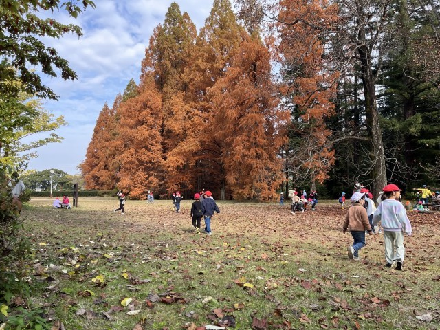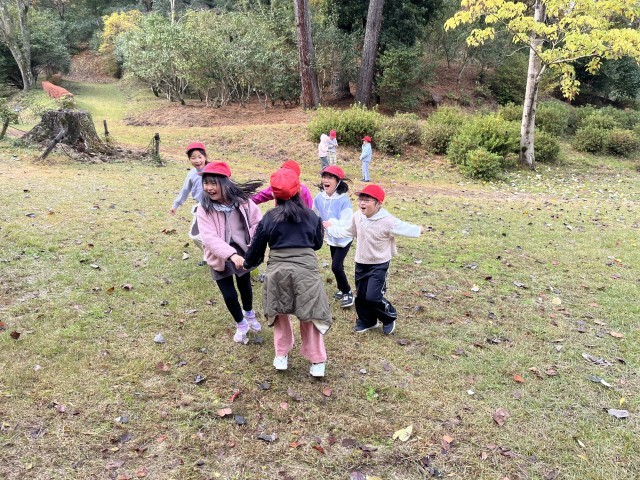 お弁当でお腹がいっぱいになった後は、広場で遊びます。