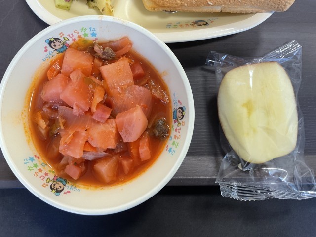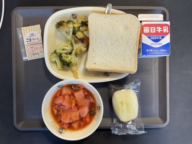 給食では、人参、ブロッコリー、さつまいもの温野菜サラダが新メニューとして、登場しました。