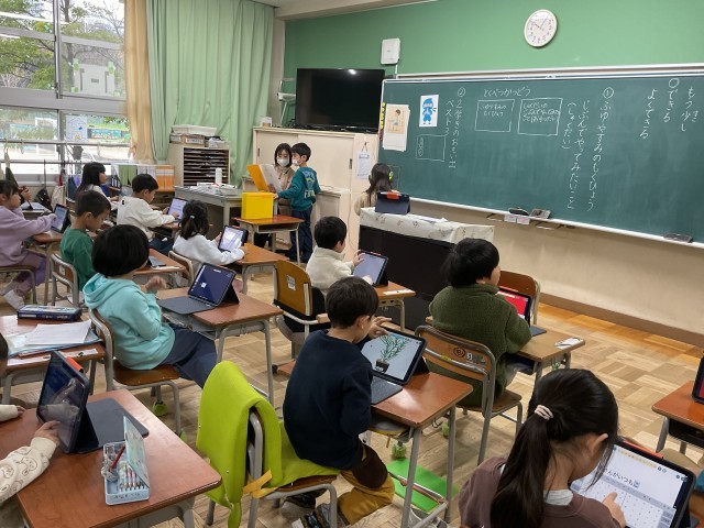 終業式後、各教室では、担任が一人ひとりに、通知表(あゆみ)を手渡しながら、2学期がんばったことを伝えました。