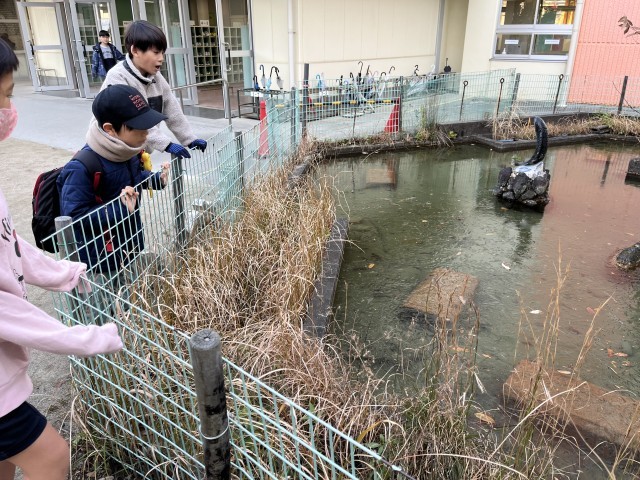 朝、登校してきた子ども達が、中庭の観察池をのぞき込んでいます。