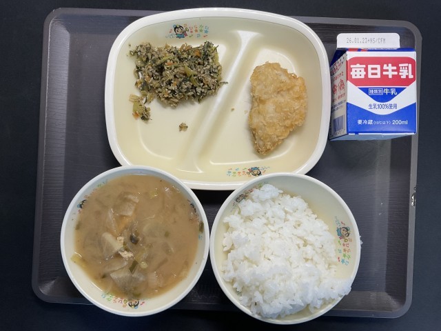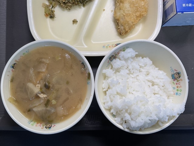 大根の根は、みそ汁の中に入っていて、大根1本まるまるおいしく食べられる献立になっています。