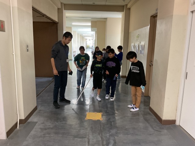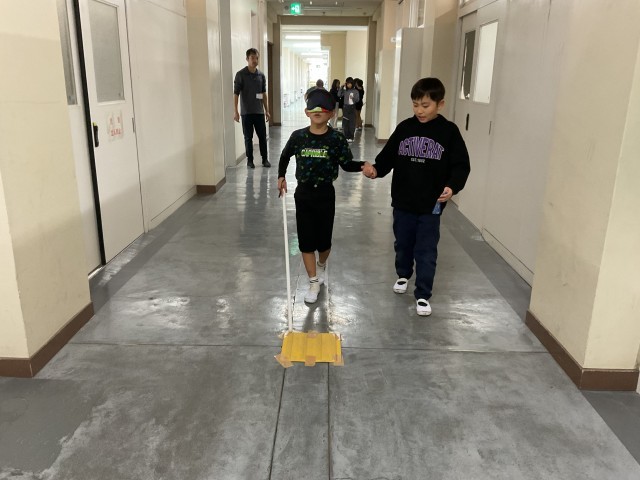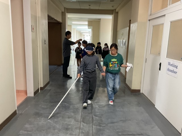 目が自由な人の気持ちに寄り添って、白杖も使って、道を歩く体験です。
