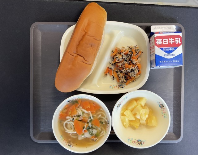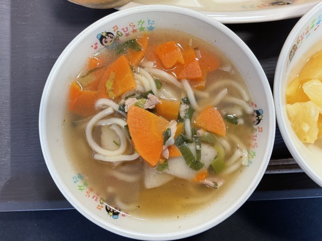 最終日は、沖縄県でよくとれる黒糖を使った黒糖パンや、パイナップル、郷土料理の「沖縄そば」です。