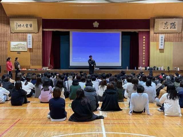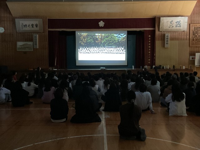 6年生を中心に、小学校生活の思い出を写真と音楽で振り返りました。