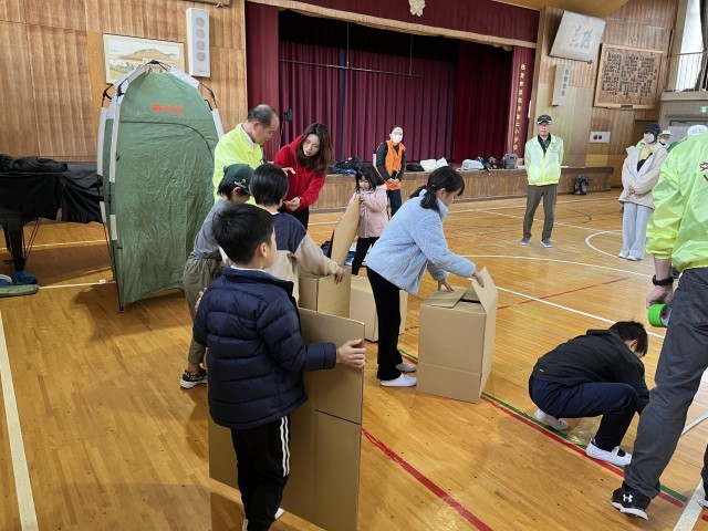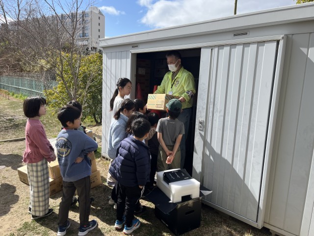 避難所の設営、持ち物ビンゴ、防災倉庫の見学を行いました。
