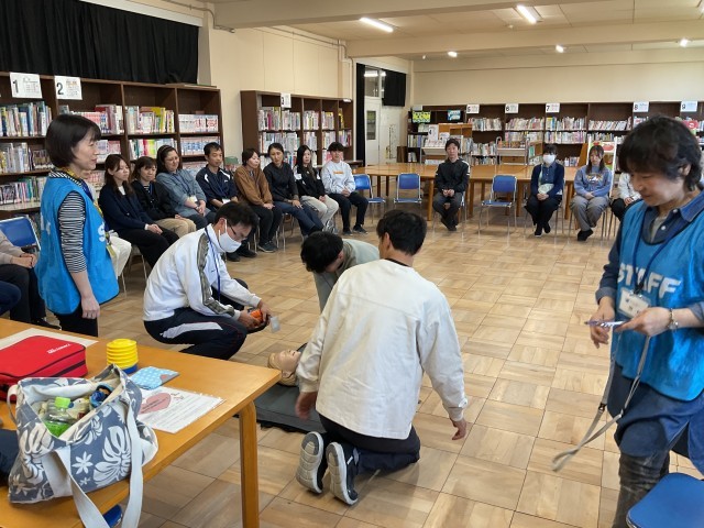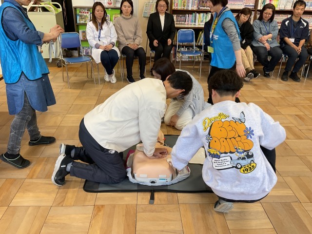 子どもが、事故で、心肺停止になった時の対応として、「あんしんポケットひらかた」の方に来ていただき、実践研修を行いました。