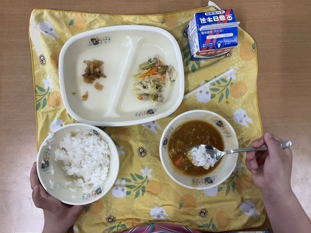 ポークカレー、アスパラソテー、ふくじんづけです。