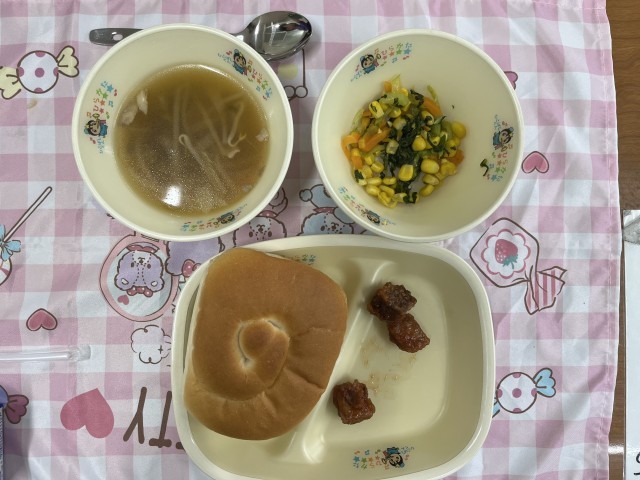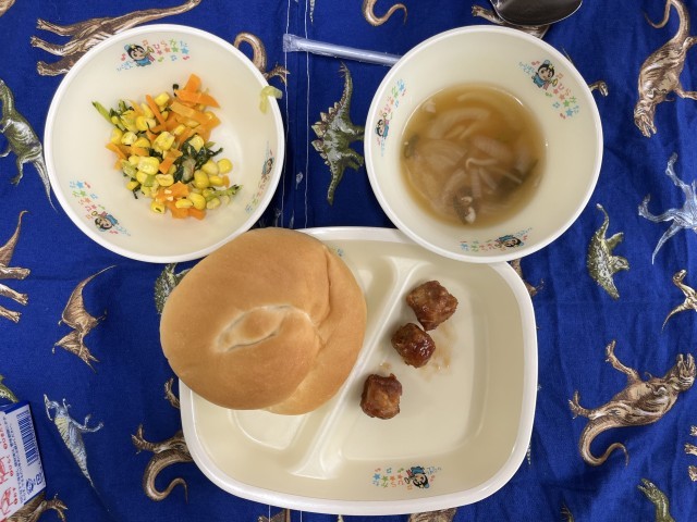 やさいスープ、マグロのノルウェーふう、コーンソテー うずまきパン です。