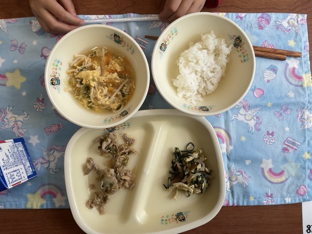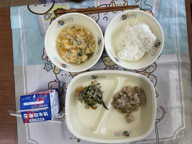 かきたまじる、ぶたにくのしょうがいため、コマツナのにびたし です。
