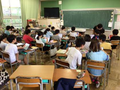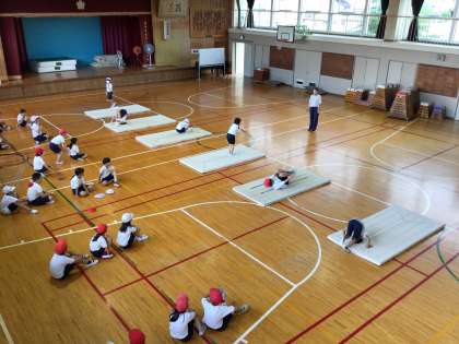 今日の4年生の5時間目の授業の様子です。1組は、体育の授業で、運動場で、走り幅跳びの練習を頑張っていました。2組は、来週9月15日(金)の校外学習の注意事項の説明を受けていました。3組は、体育の授業で、体育館で「前転」の練習を頑張っていました。