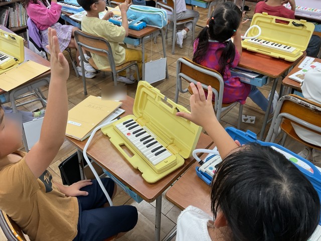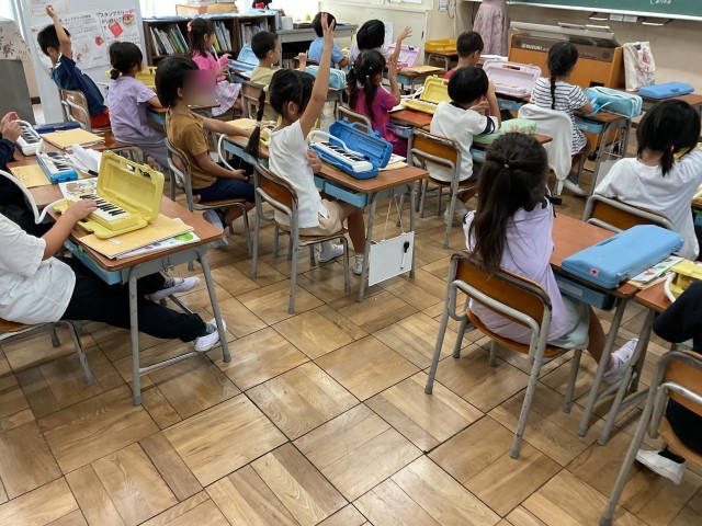 音楽では、ドレミの指づかい。こちらも、先生のお話を聞きながら