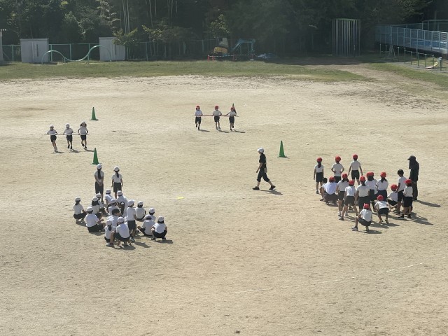 運動会のチーム決めや学年団体種目「台風の目」のルールなどを朝の活動で話し、