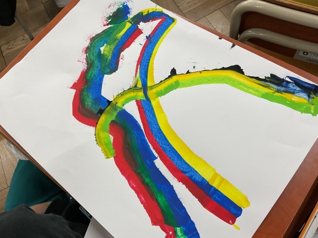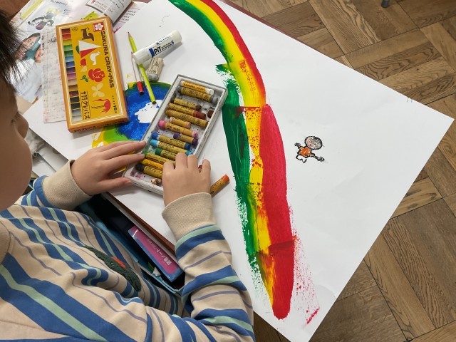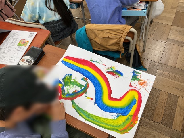 と、えのぐを引っぱり、虹を描く そこにストーリー性を持たせていくといった作品作り。