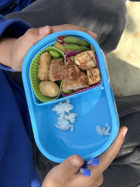 開けてすぐに食べ始めてしまったので、中身の少なくなってしまっているものもありますが、どれも子どもたちの自慢のお弁当です。