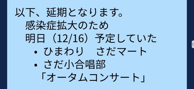 12/15 明日のさだマート(ひまわり)及び合唱部オータムコンサートの延期について(日程未定)