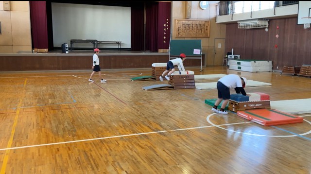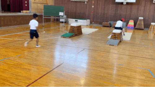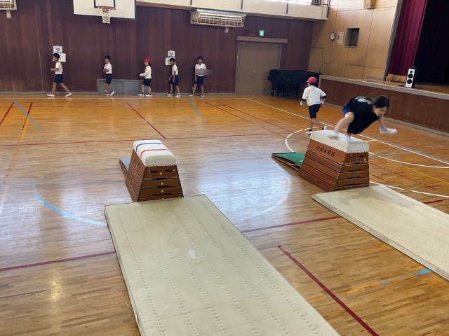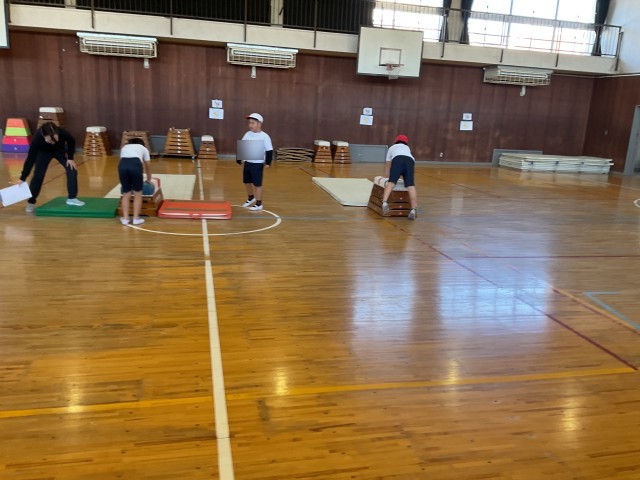 台上前転や4段や5段に一つひとつ挑戦していました。