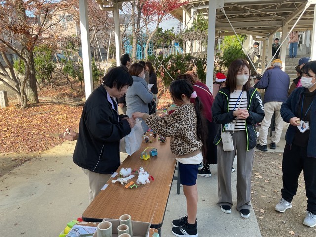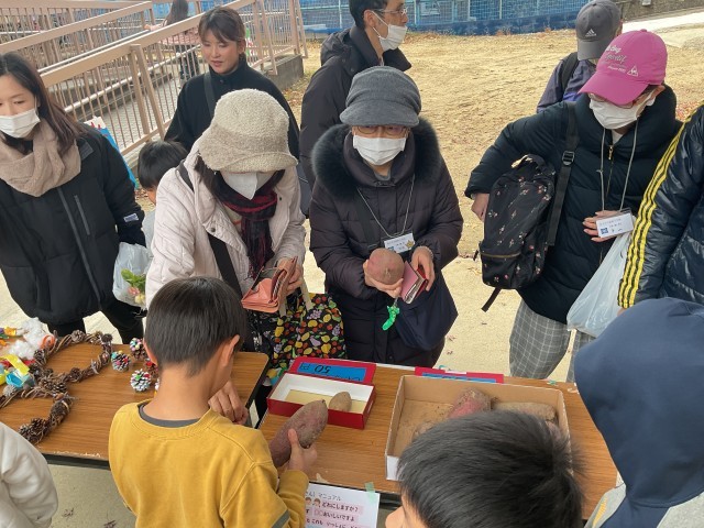 12月22日(月)お昼に、ひまわり学級の子どもたちが収穫した野菜やクリスマスリースなどの製作物を販売する「冬のさだマート」を行いました。あいにく、雨のぱらつきがあったために、正門前から体育館前に移動することになりましたが、たくさんの方に来校いただけて、大盛況でした。