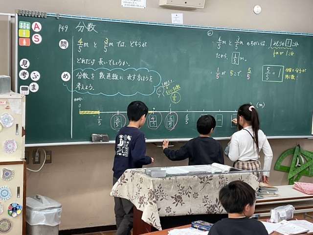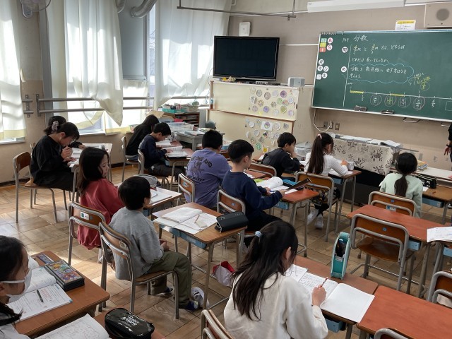 今日は3年生が、算数で「1より大きい分数」に取り組んでいました。これまでの学習では分数は“1より小さいもの”というイメージがあったようで、はじめは少し不思議そうな様子も見られました。