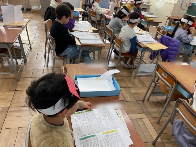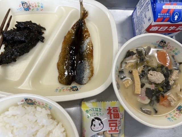 目を光らせていました。節分ですね。給食には福豆、いわし。