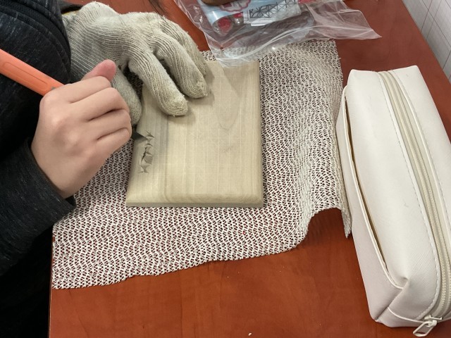 彫刻刀で丁寧に削っていっています。