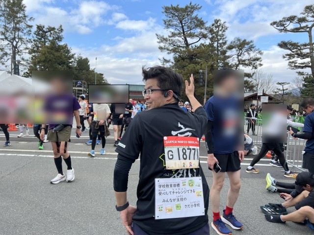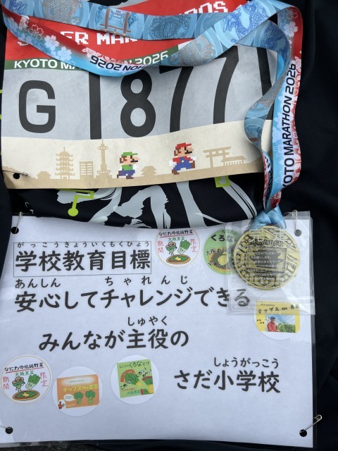 学校教育目標「安心してチャレンジできるみんなが主役のさだ小学校」を背負って42.195キロなんとか完走できました。
