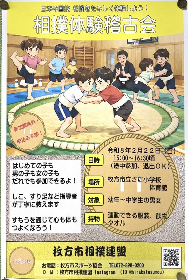 2月22日(日)さだ小学校で「相撲体験稽古会」あります。