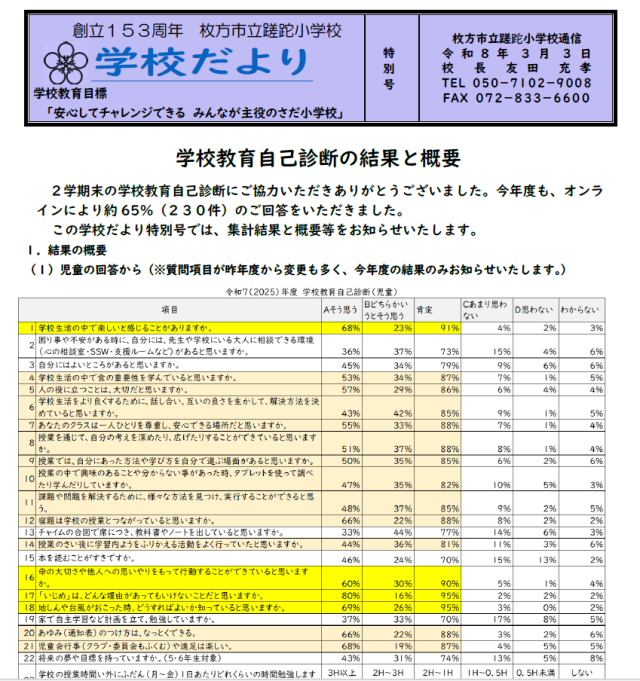 2学期末の学校教育自己診断にご協力いただきありがとうございました。