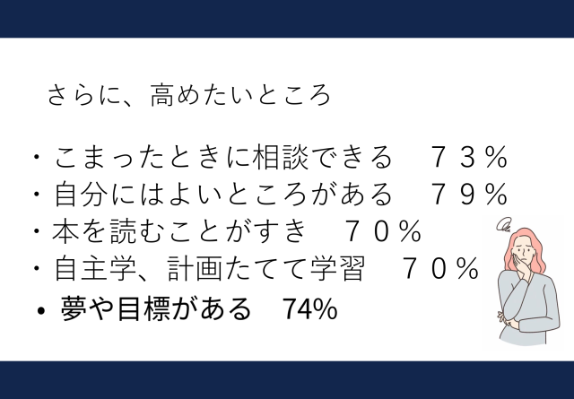 私からも学校教育自己診断「自分にはよいところがある」が70%台であったことから