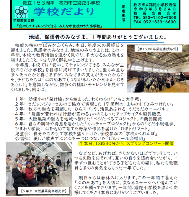 学校だより年度末号 発行 公開日 2026/03/26 更新日 2026/03/26 学校の様子 R07-学校だより(R080324 年度末号)(1)今年度もたいへんお世話になり、ありがとうございました。学校だより年度末号を発行いたしました。次年度もどうかよろしくお願いいたします。 いいね(0)