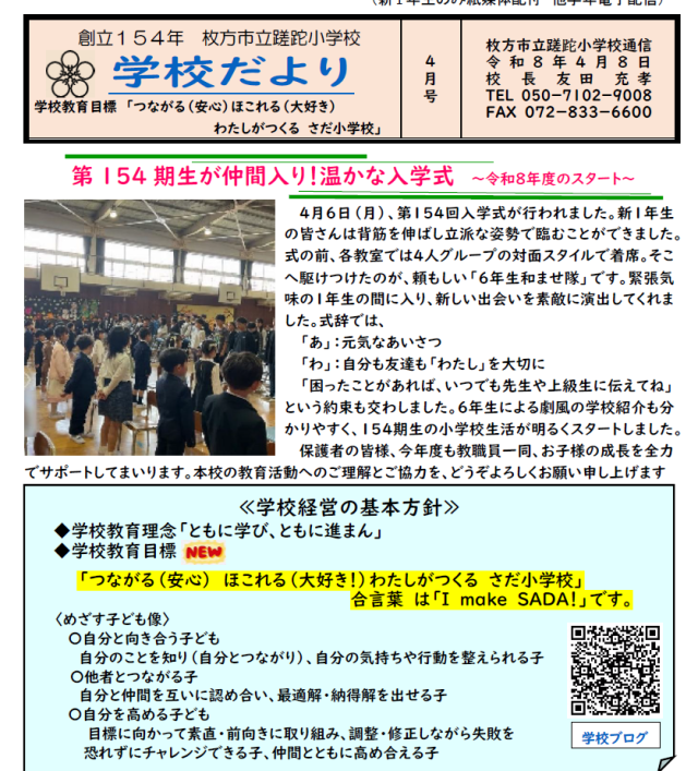 4/8 学校だより 4月号発行 公開日 2026/04/08 更新日 2026/04/08 学校の様子 R08-学校だより(4月号)ブログ版を発行いたしました。今年度もどうぞよろしくお願いいたします。合言葉は、「アイ メイク さだ!」です いいね(0)