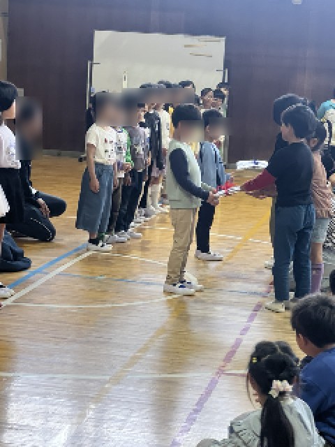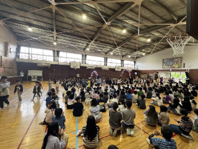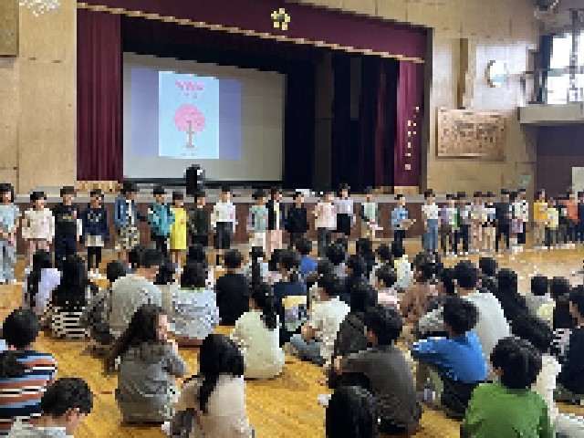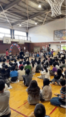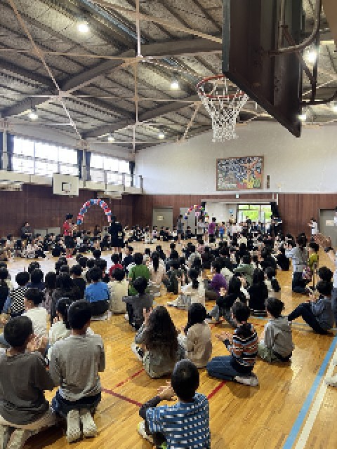 体育館に全校児童が集まり、