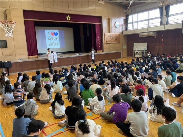 校長からは、学校目標の「つながる(安心)」「ほこれる(大好き)」「わたしがつくる」の紹介と合言葉「I make SADA!」を確認し、みんなで読み上げました。